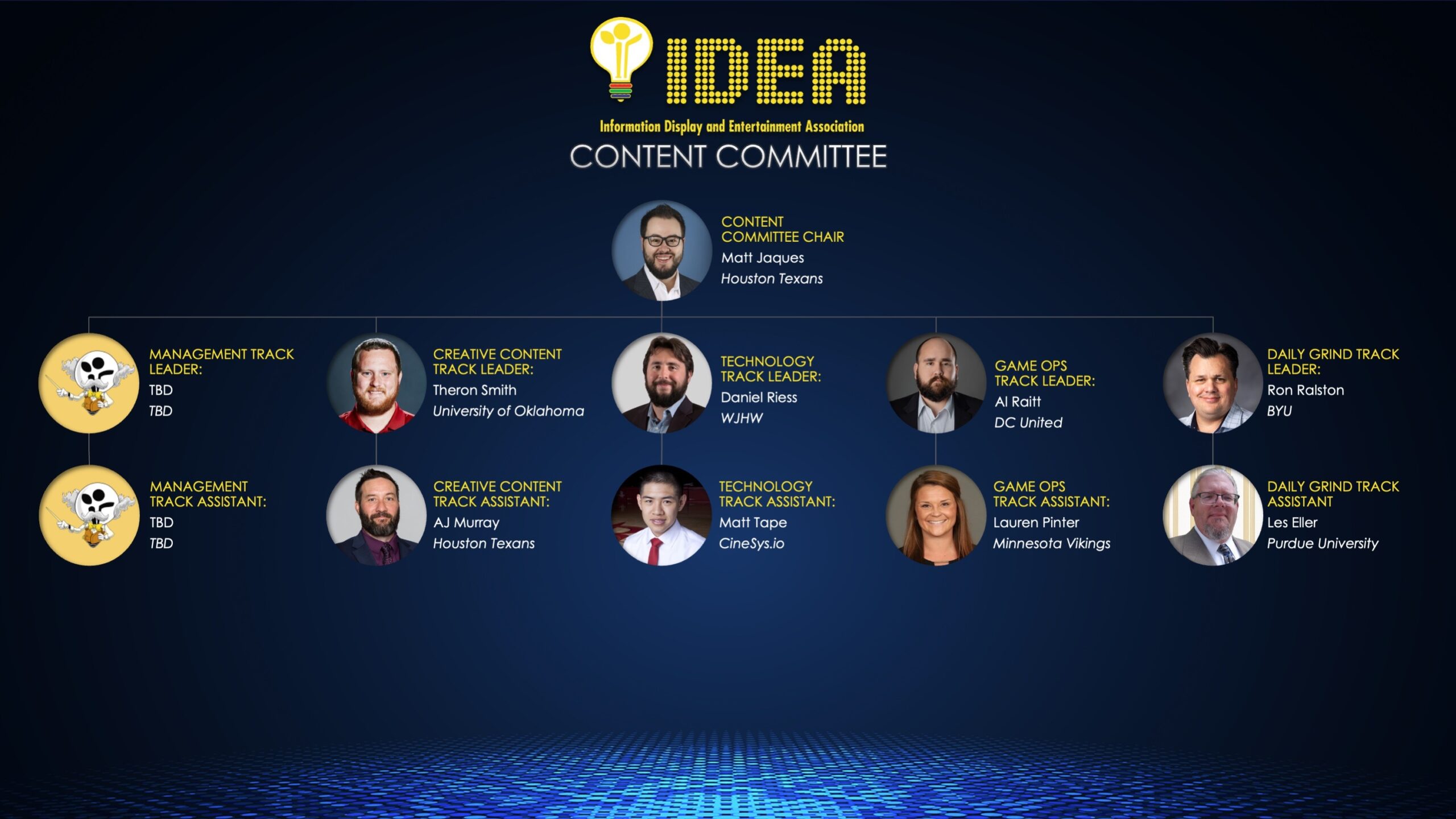 IDEA is a not-for-profit professional association for organizations in the Game and Event Presentation industry that is governed by an elected Executive Board with day-to-day operations conducted by office staff. The Standing Committees direct and make recommendations to the Board about the various segments of IDEA which they oversee. Members are encouraged to be active in the direction of IDEA by participating on one of the various committees or running for elected office.